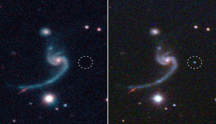 До и во время взрыва сверхновой iPTF14gqr (круг) в удаленной от нас на 920 миллионов световых лет спиральной галактике