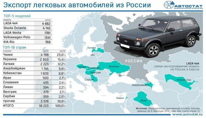 Показатели других стран составляют менее тысячи единиц. Самым экспортируемым автомобилем за отчетный период является выпускаемая на АВТОВАЗе LADA 4x4, показатель которой достиг 4 662 экземпляра. На втором месте - Skoda Octavia c 4145 автомобилями.