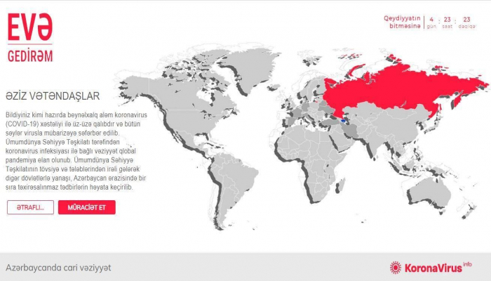 Азербайджан запустил портал Evə gedirəm ("Еду домой"), разработанный для соотечественников, не имеющих возможности вернуться на родину в связи с пандемией коронавируса (COVİD-19), сообщает в субботу Trend.
