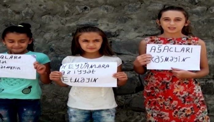 В Агдаше группа детей провела необычную акцию. Дети расклеили на территории села таблички с призывами охранять природу и защищать животных.
