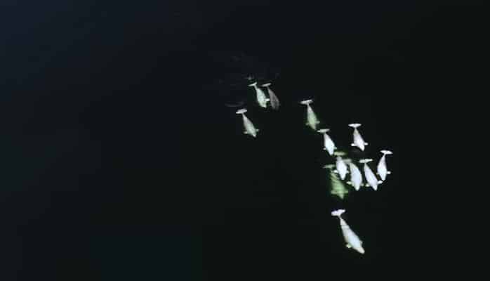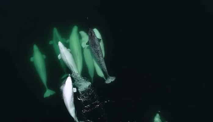 Съемка с дрона позволила задокументировать редкий случай: тесное взаимодействие белух и нарвала.
