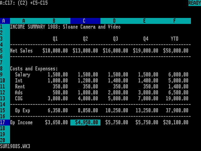 26 января 1983 года представлен табличный процессор Lotus 1-2-3. Такое необычное название редактор таблиц получил из-за того, что включал в себя 3 элементы: таблицы, графики и основные возможности базы данных. В течение первого года существования программы объём продаж программы превзошёл самую популярную до этого таблицу VisiCalc. Популярность Lotus объяснялась безошибочностью и скоростью работы. Добиться этого удалось, написав код на ассемблере, а вывод на экран работал без BIOS, а с помощью непосредственной записи данных в видеопамять. В 1995 году IBM купила компанию Lotus и далее программа 1-2-3 развивалась как часть офисного пакета Lotus Smart Suite. Постепенно на рынке Microsoft Excel вытеснил Lotus.