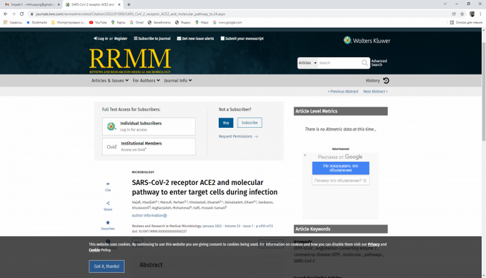 Статья «SARS-CoV-2 receptor ACE2 and molecular pathway to enter target cells during infection» («Рецептор ACE2 вируса SARS-CoV и молекулярный путь проникновения в клетку во время инфекции») опубликована в первом выпуске журнала Reviews and Research in Medical Microbiology за 2022 год.
