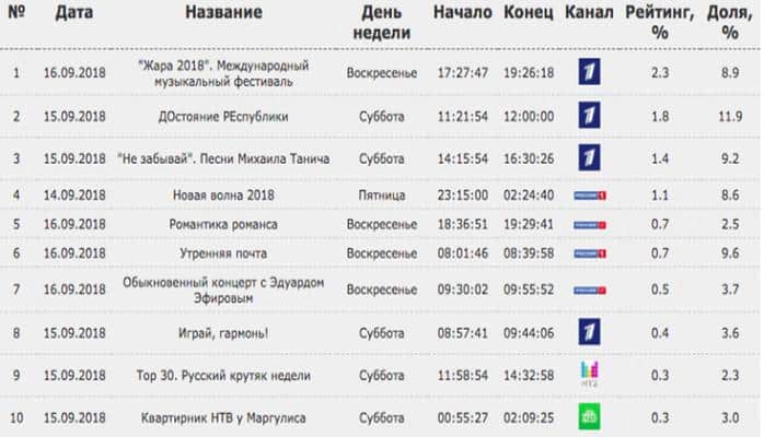 Мировой лидер в предоставлении комплексной медиа- и маркетинговой информации компания Mediascope представила топ-программы музыкального жанра на российских телеканалах в период 10-16 сентября. Рейтинг вновь возглавил Международный фестиваль "Жара", который транслировался по Первому каналу России, сообщает Trend Life.