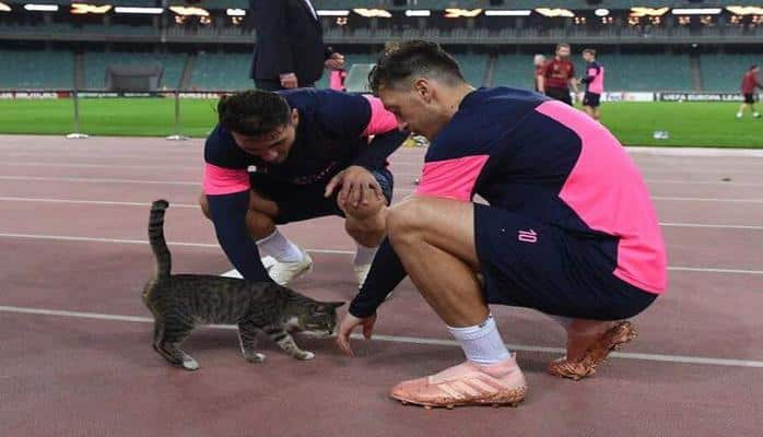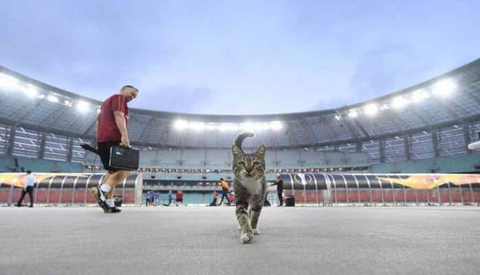 Как передает Oxu.Az, внимание футболистов привлекла кошка, разгуливающая по беговым дорожкам стадиона.