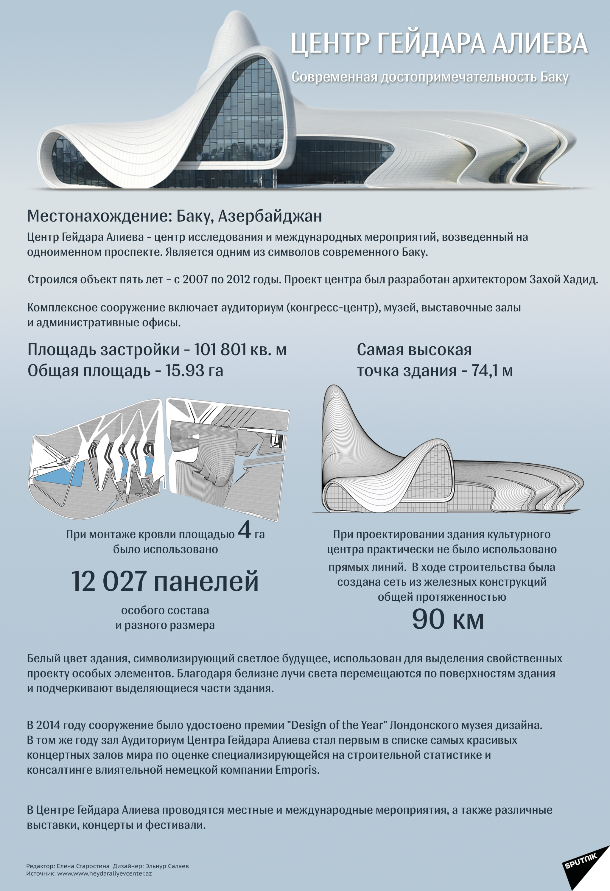 Центр, за который известный архитектор Заха Хадид получила престижную британскую премию, давно стал символом Баку. Интересные сведения о нем представит читателям инфографика Sputnik.