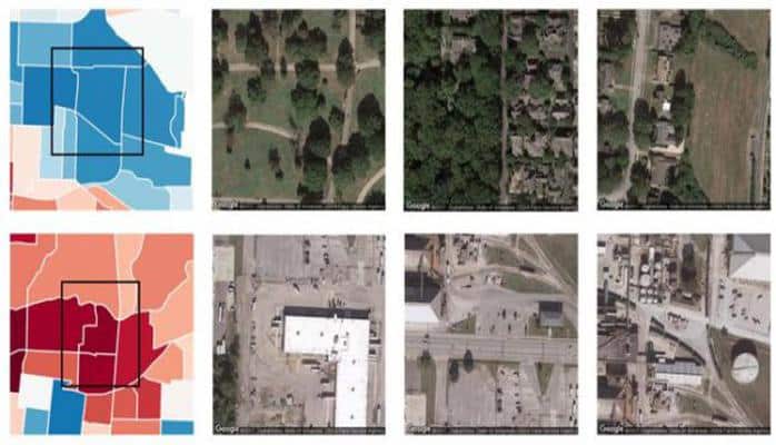 На примере Мемфиса ИИ удалось выявить, что области с высокой степенью озеленения (сверху на фото) ассоциированы с низкой распространенностью ожирения среди жителей. И, наоборот, там, где количество зеленых насаждений меньше (фото снизу)- процент ожирения выше.