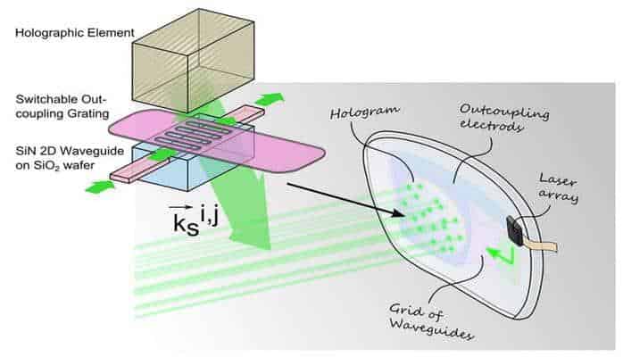 Фотоны из лазера или другого источника света через светопроводящий компонент направляются в голографический оптический элемент, находящийся в линзе очков. Голографические оптические элементы, значительно меньшие, чем их традиционные аналоги, могут быть сформированы в светочувствительных пластиках с использованием тех же лазерных световых взаимодействий, которые используются для формирования голограмм, скажем, для защиты кредитных карты от подделки. Для синхронизации фотонов путем согласования фазы с опорным лучом используется сетка световодов — она может быть сформирована с использованием технологий изготовления полупроводниковой продукции, уже опробованных для изготовления фотонных схем.