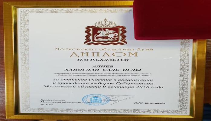 Ханоглан Алиев получил диплом Московской Областной Думы
