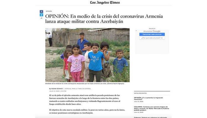 Со статьей можно ознакомиться по ссылке: https://www.latimes.com/espanol/opinion/articulo/2020-07-13/opinion-en-medio-de-la-crisis-del-coronavirus-armenia-lanza-ataque-militar-contra-azerbaiyan