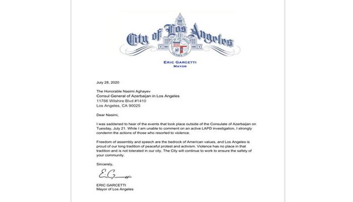 Мэр Лос-Анджелеса отметил, что свобода собрания и свобода слова являются основами американских ценностей, добавив, что усилия по обеспечению безопасности азербайджанской общины Лос-Анджелеса будут продолжены.