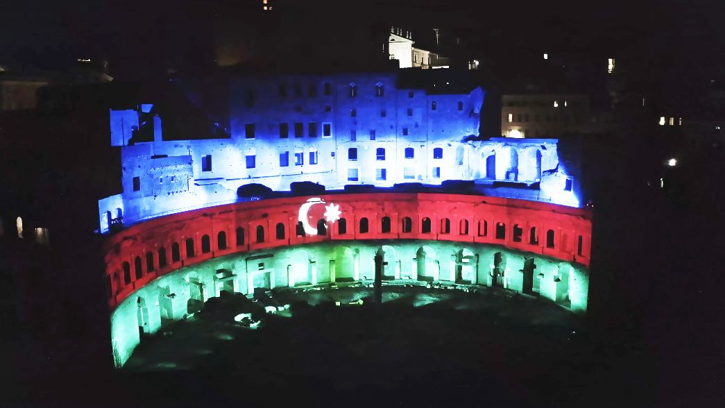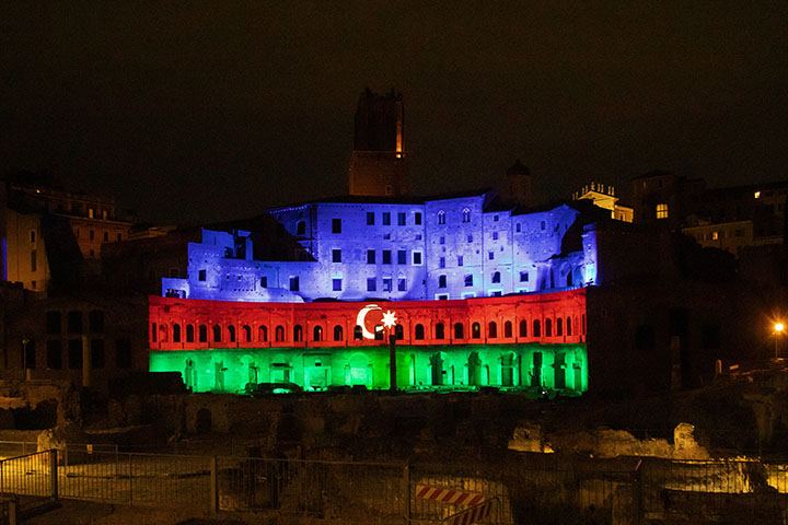 По случаю Национального праздника 28 Мая - Дня Республики -грандиозный монументальный комплекс Mercati di Traiano, находящийся в самом древнем историческом центре Рима, освещен цветами флага Азербайджана под аккомпанемент его же государственного гимна.