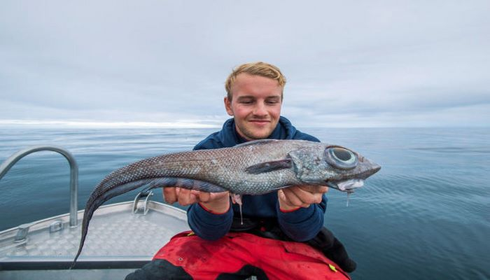 19-летний норвежец Оскар Лундал рыбачил неподалеку от острова Аннейа и рассчитывал выловить палтуса. Но ему попалось кое-что поинтереснее. Парень вытащил на борт существо с огромными глазами, которое одновременно было похоже на динозавра и пришельца.