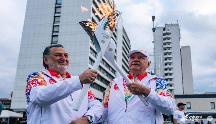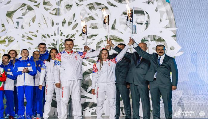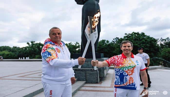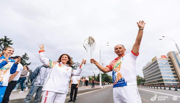 Приняла эстафету в городе олимпийский призер по художественной гимнастике Любовь Черкашина. Она передала символ мультиспортивного форума народному артисту Беларуси Владимиру Гостюхину. Затем уже до Площади государственного флага факел несли известные представители спорта, культуры, СМИ, здравоохранения и производства. Среди них был также олимпийский чемпион, двукратный чемпион мира и трехкратный чемпион Европы по греко-римской борьбе, азербайджанец Кямандар Меджидов.