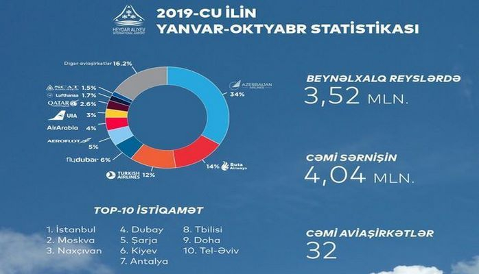 В октябре 2019 года в Международный аэропорт Гейдар Алиев осуществляли полеты 32 пассажирские авиакомпании, которые выполняли рейсы по более 60 различным направлениям.