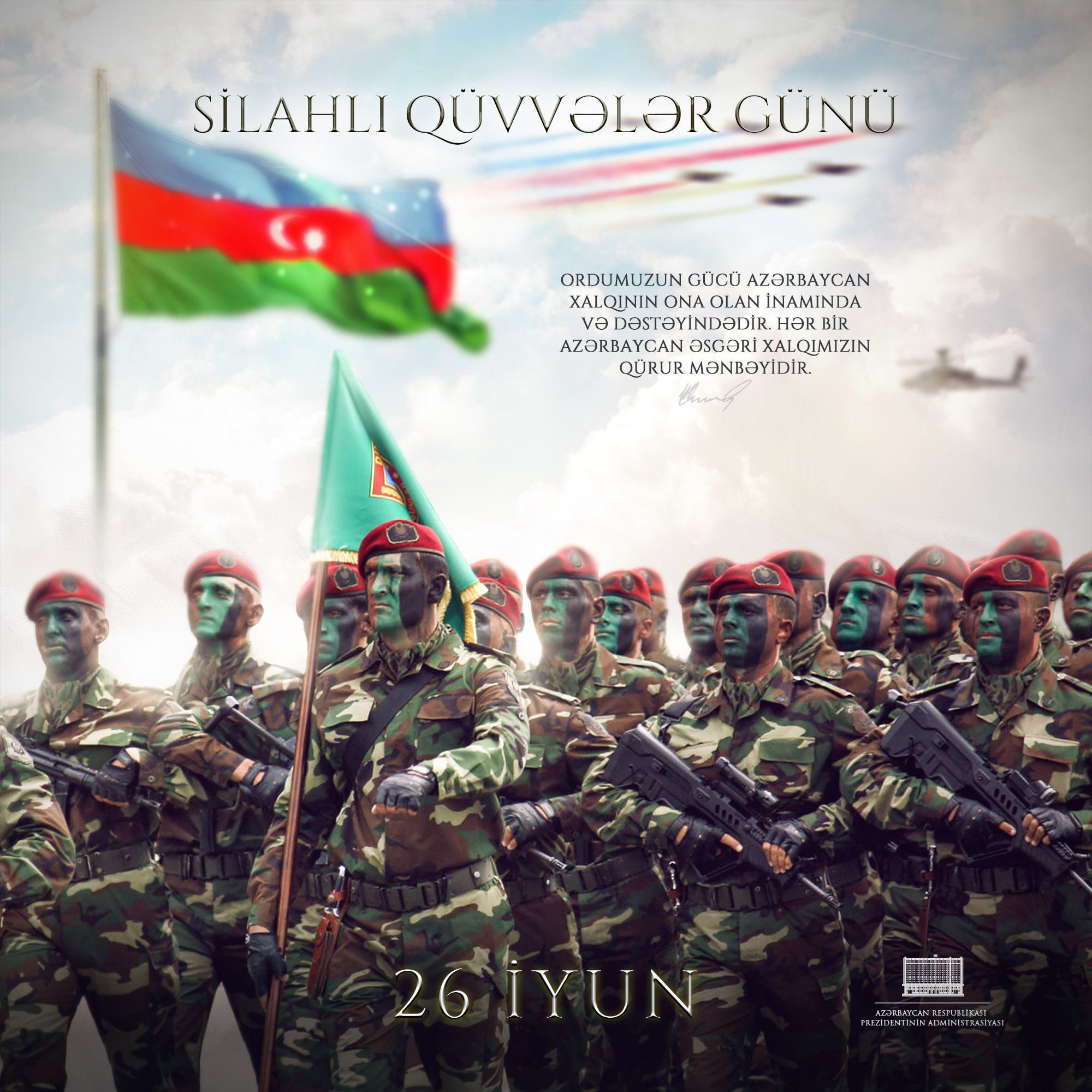 Президент Азербайджанской Республики, Верховный главнокомандующий Ильхам Алиев на официальной странице в Facebook поделился публикацией по случаю 26 июня - Дня Вооруженных сил.