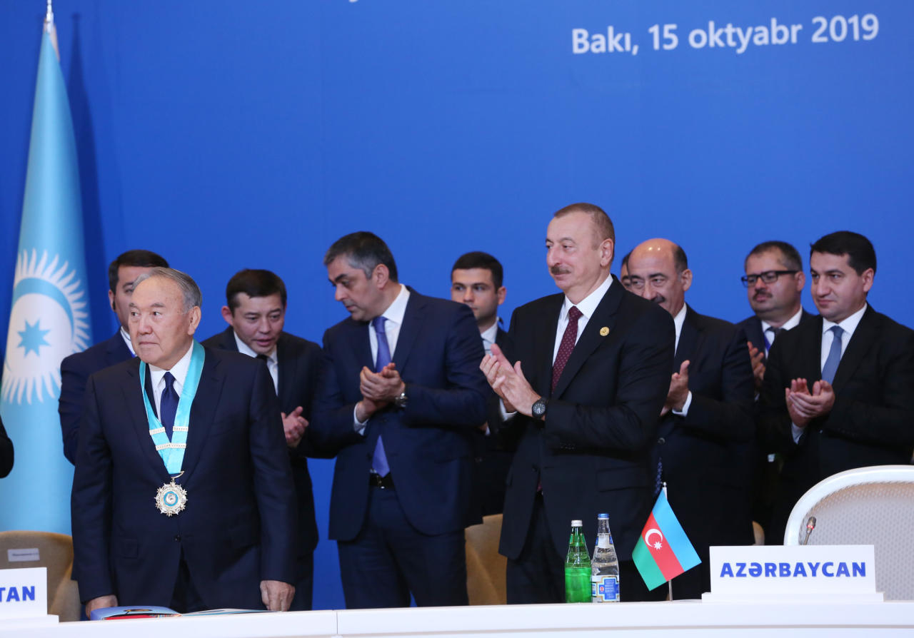 Затем глава государства вручил первому Президенту Республики Казахстан, почетному председателю Совета сотрудничества тюркоязычных государств Нурсултану Назарбаеву "Высший орден тюркского мира".
