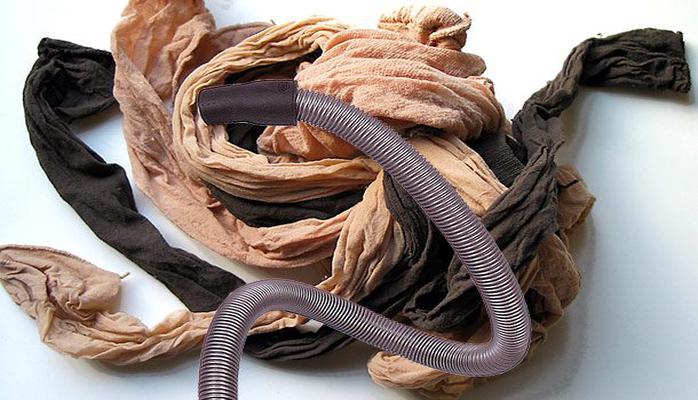 Большинству женщин знакома ситуация, когда упавшая на пол сережка закатывается за кресло, под кровать или в щель. Натяните капроновые колготки на всасывающее отверстие шланга пылесоса и пропылесосьте место предположительного нахождения пропажи. Если сережка действительно там, она просто притянется вакуумом, но внутрь не попадет, ткань задержит ее.