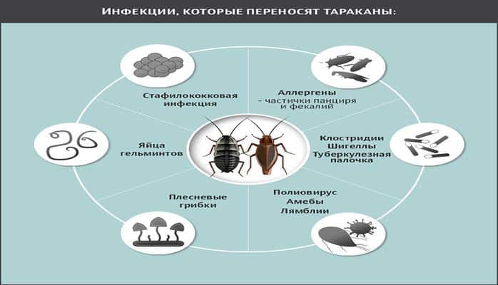 Множество микроорганизмов обитает в кишечнике таракана. Среди них для человека опасность представляют эндоамебы, протисты, туберкулезная палочка. Они не разрушаются в организме насекомых и с фекалиями попадают в пищу и воду. Однако точных данных о том, что именно тараканы заражают человека этими микробами, нет.