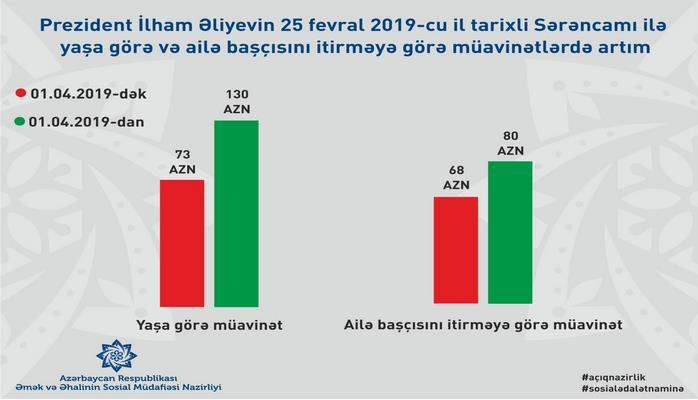 Повышение предусмотрено распоряжением Президента Азербайджана Ильхама Алиева «О дополнительных мерах в сфере усиления социальной защиты населения», подписанного 25 февраля 2019 года.