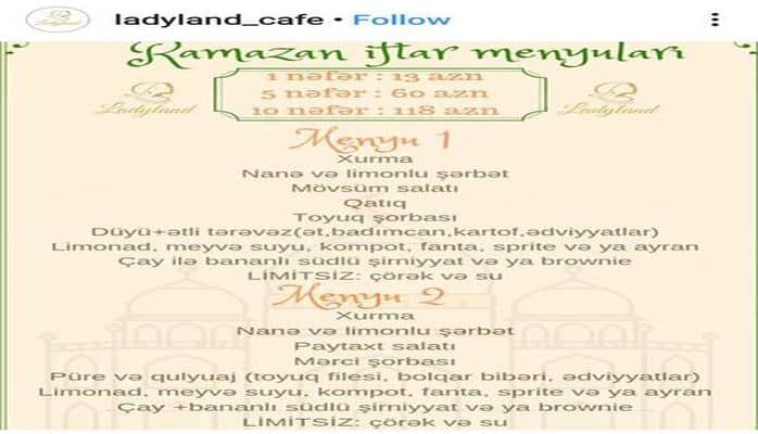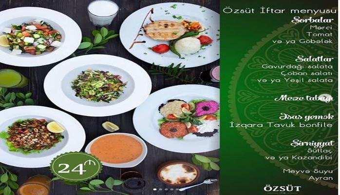 В этом ресторане также подается ифтар-меню. Оно бывает двух видов. В отличие от других ресторанов, здесь предлагаются специальные скидки. Ифтар-меню на одного человека стоит 13 манатов, на пять человек - 60 манатов, а на 10 человек - 118 манатов.