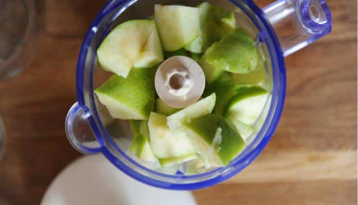 Перед тем, как загрузить яблоки в блендер, их нужно почистить, вырезать сердцевину, удалить косточки и нарезать небольшими кусочками. Но, когда готовите сок в блендере, сначала получается пюре. Для сока измельченные яблоки обязательно нужно процедить через марлю или самое мелкое сито, а жмых хорошо отжать.