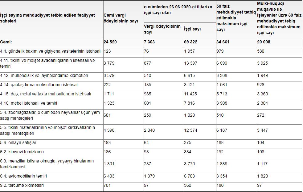 Сферы деятельности в Азербайджане, в которых ограничено число сотрудников во время карантина (ТАБЛИЦА)