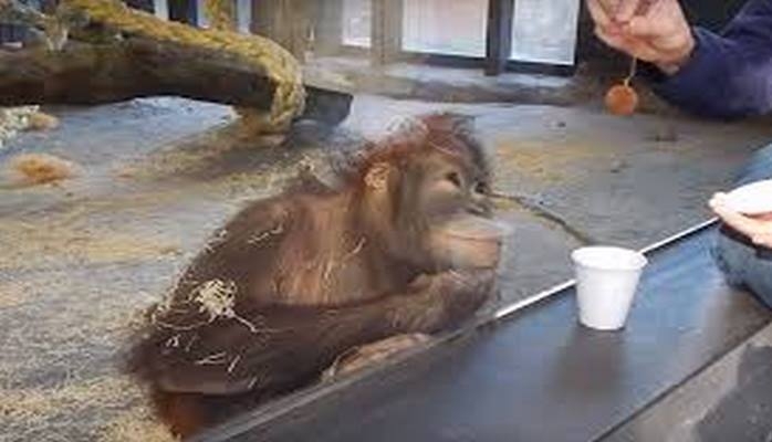 Мужчина сел возле стекла перед обезьяной, положив в пустой стакан ягоду и закрыл его крышкой. Перемешав содержимое, незаметно для шимпанзе выбросил ягоду и снова показал ей стаканчик. Обезьяна недолго думая начала смеяться, упав на спину.
