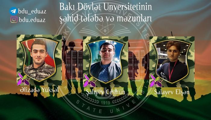 Шехидами во время Отечественной войны стали выпускники и студенты БГУ Турал Эйюбов, Джавид Манафов, Атамали Мусаоглу, Манаф Бахманли, Гусейн Гулиев, Сейфаддин Дадашев, Надыр Надырли, Ниджат Ахмедов, Шахрияр Габиби, Кянан Мамедов, Юксель Ализаде, Эльшан Салаев, Фикрет Зейналлы, Джейхун Шалиев, Тархан Гурбанов, Шамиль Наджафов и Вугар Мамедов.