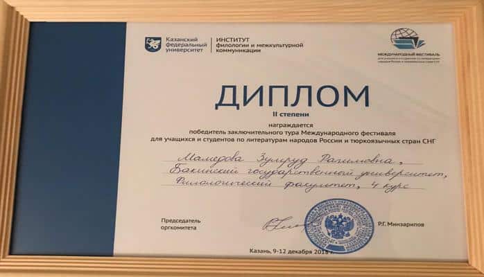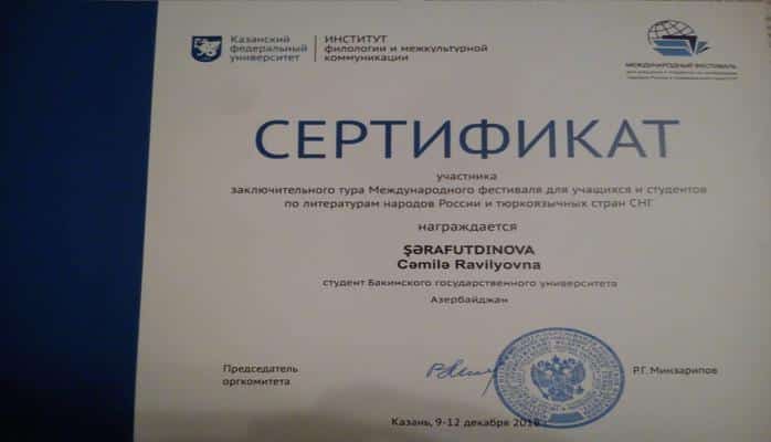 В городе Казан прошел заключительный тур I Международного фестиваля для учащихся и студентов по литературам народов России и тюркоязычных стран СНГ, в которой приняли участие две студентки филологического факультета Бакинского государственного университета (БГУ): Джамиля Шарафутдинова и Зумруд Мамедова.