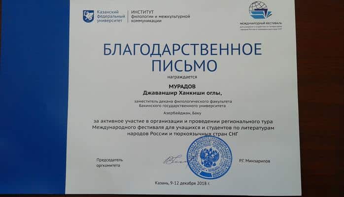 Научный руководитель студентов, заведующий кафедрой истории русской литературы БГУ, профессор Агил Гаджиев и заместитель декана, доцент Джаваншир Мурадов, принявший активное участие в организации и проведении регионального тура Оргкомитетом фестиваля награждены «Благодарностью».