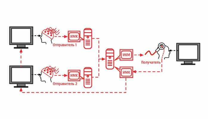 В эксперименте американских ученых два участника (отправитель 1 и отправитель 2) принимали решение, перевернуть фигуру или нет. Сигнал их мозга считывался ЭЭГ и с помощью интерфейса "мозг — компьютер" (ИМК) передавался в мозг третьего участника (получателя) в виде магнитного импульса через интерфейс "компьютер — мозг" (ИКМ). Импульсы генерировала установка на основе транскраниальной магнитной стимуляции. Магнитные импульсы воздействовали на зрительную кору мозга получателя, и у него возникало зрительное ощущение — небольшое светящееся пятно. В большинстве случаев получатель интерпретировал его правильно и при помощи интерфейса "мозг — компьютер" (ИМК) выполнял необходимое действие.