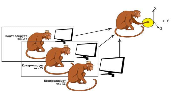 В эксперименте ученых из Университета Дьюка изолированные друг от друга макаки-резусы через интерфейс "мозг — компьютер" (на основе ЭЭГ) научились вместе управлять виртуальной рукой, изображенной на мониторе. Каждое животное отвечало за управление двумя из трех осей движения руки — X и Y, X и Z, Y и Z. Обезьяны, благодаря "совместному" нейроинтерфейсу и семи сотням электродов, встроенных в их двигательную кору, могли обмениваться информацией о положении руки на их мониторе и корректировать ее движение.