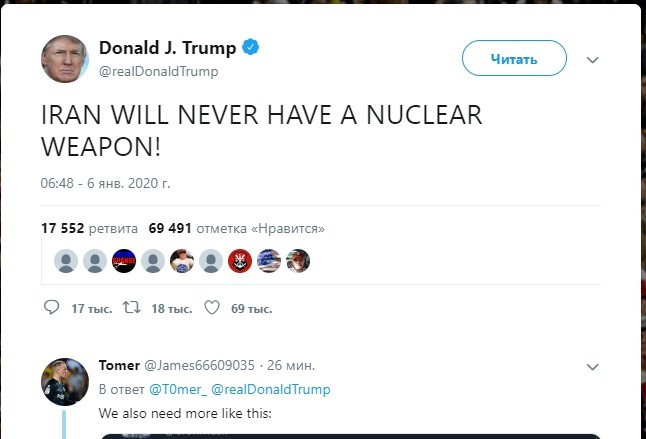 "У Ирана никогда не будет ядерного оружия!" - написал он в понедельник в Twitter полностью заглавными буквами, передает Report.