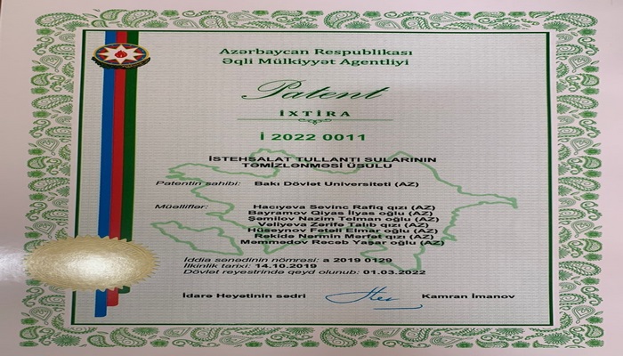 Сотрудники кафедры экологической химии факультета экологии и почвоведения Бакинского государственного университета получили патент под названием «Способ очистки промышленных сточных вод».