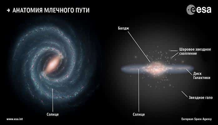 Нашу галактику можно представить как шар с несколькими лучами. Если его раскрутить, то лучи обернутся вокруг в виде спиралей — астрономы называют их рукавами. Их минимум четыре, а может быть, и семь — точнее сказать пока нельзя. Солнечная система находится в северном галактическом полушарии, в рукаве Ориона, на высоте 80-90 световых лет над плоскостью экватора.