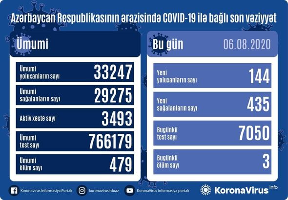 До сегодняшнего дня коронавирусом в Азербайджане заразились 33 247 человек, 479 из них скончались, 29 275 - излечились, 3 493 - находятся на лечении в больницах особого режима.
