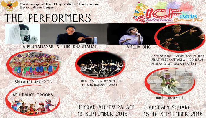 Так, индонезийской группой "Tubaba Pakem" зрителям были продемонстрирован традиционный танец с острова Суматра Sembah Sigeh, исторически исполнявшийся перед королями и особо почетными гостями, а сегодня чаще всего его танцуют на индонезийских свадьбах или других важных мероприятиях. Танцевальная группа индонезийского центра Азербайджанского университета языков исполнила традиционный ритуальный танец плодородия Cecer Qandrunq, традиционный танец с острова Явы Rampak Kindanq, танец Inqqanq.