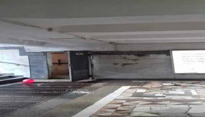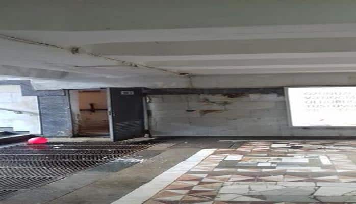 На фото видно, как на выходе из станции течет вода, что создает трудности для передвижения пассажиров.