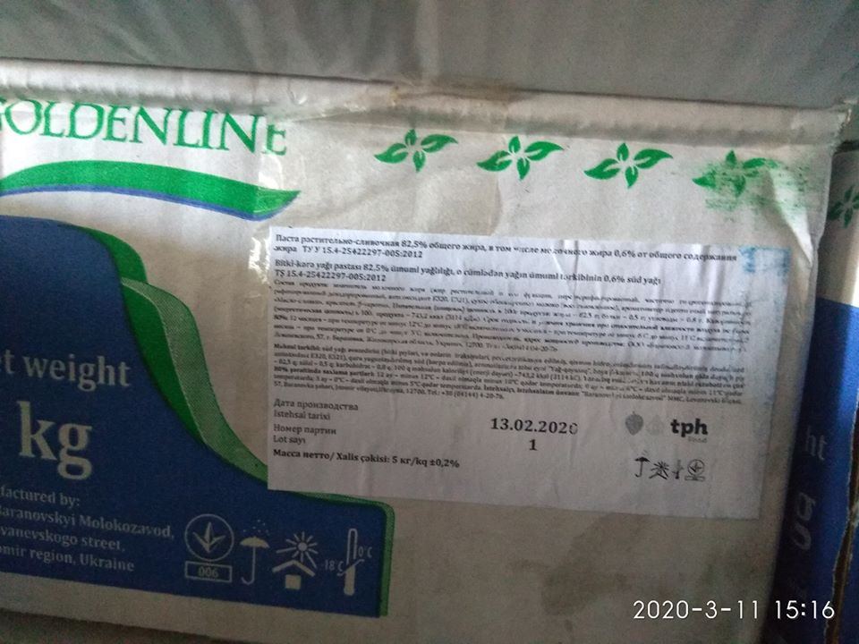 На складе было выявлено 670 килограммов спреда Goldenline, упакованного под видом сливочного масла. Пробы взятые с продукции были отправлены в соответствующие лаборатории Института пищевой безопасности.