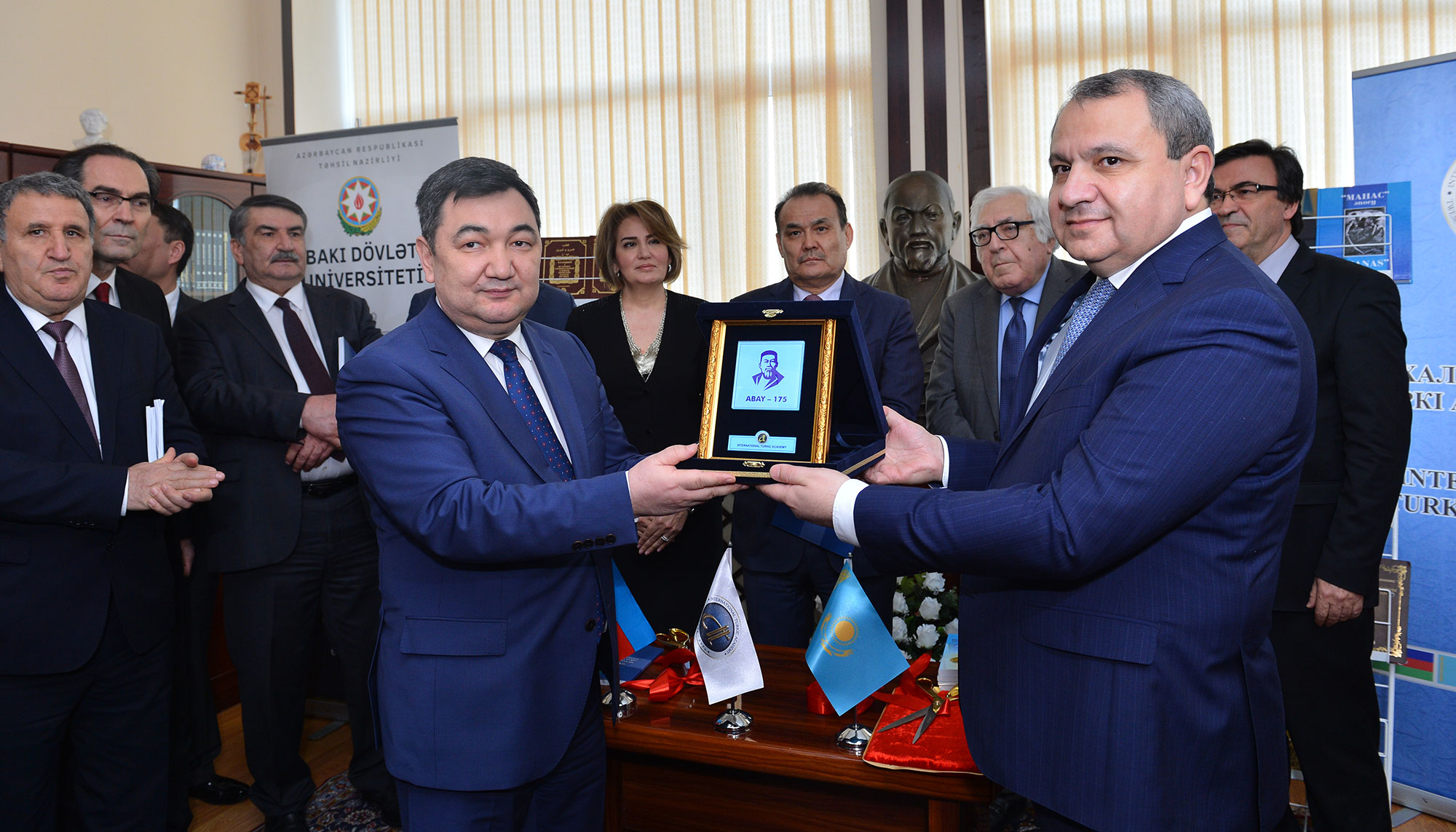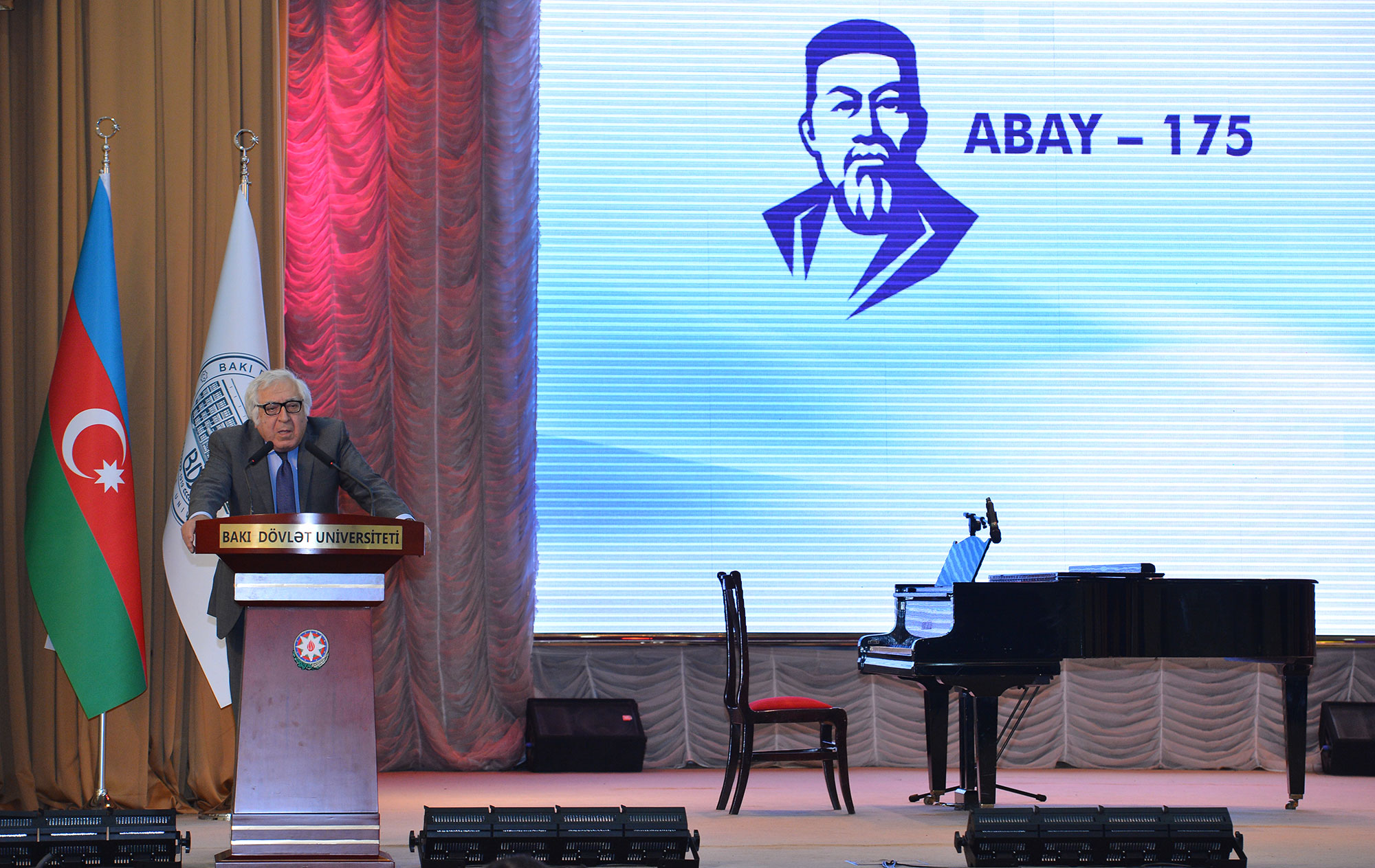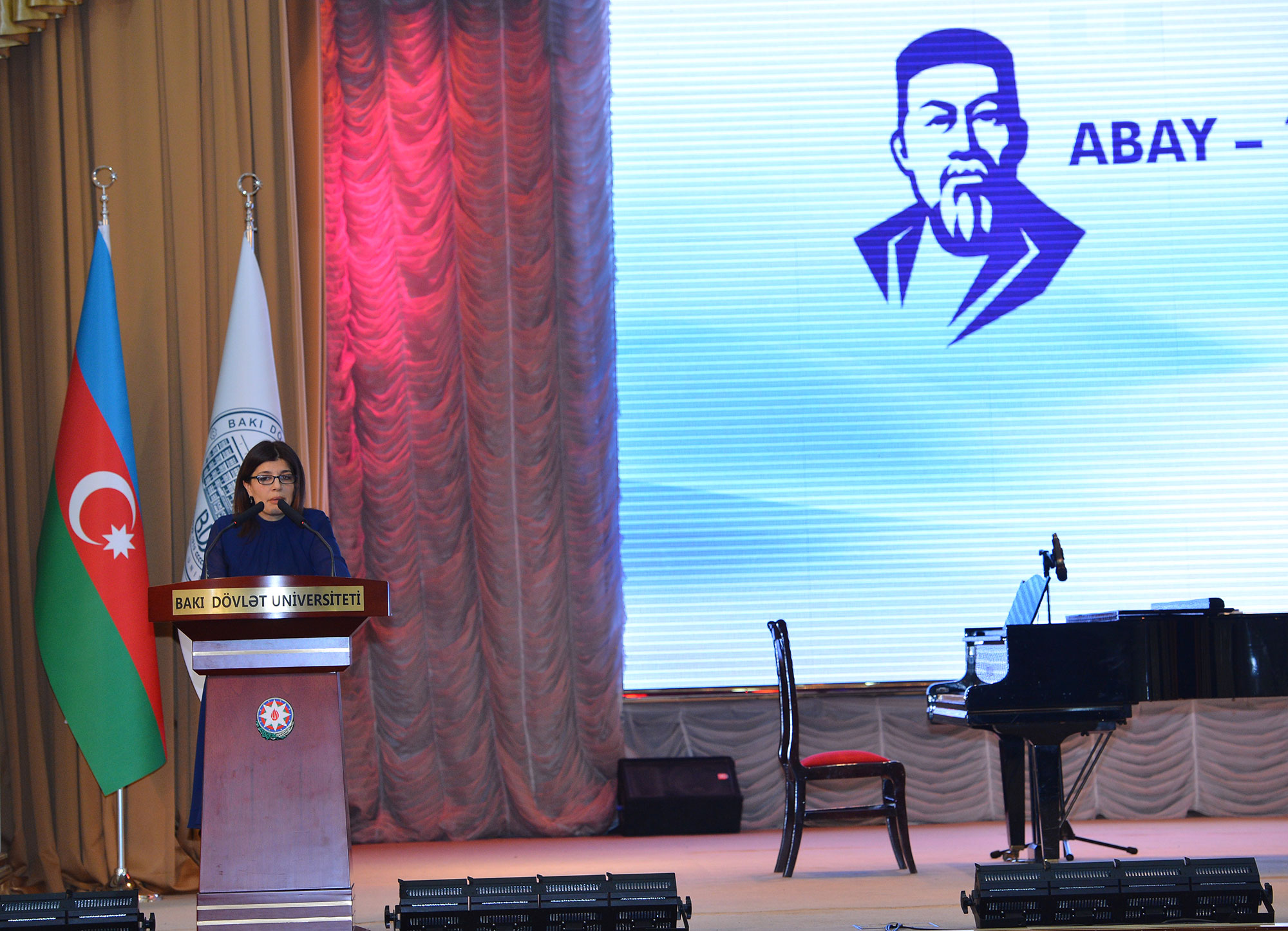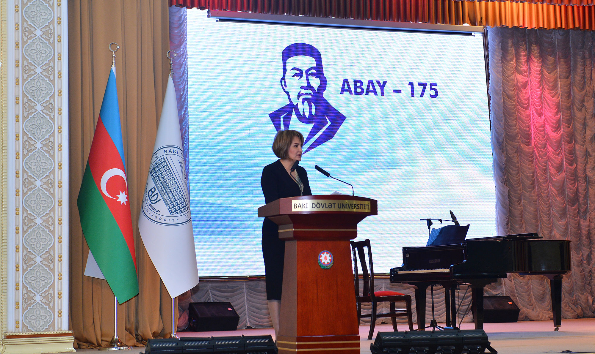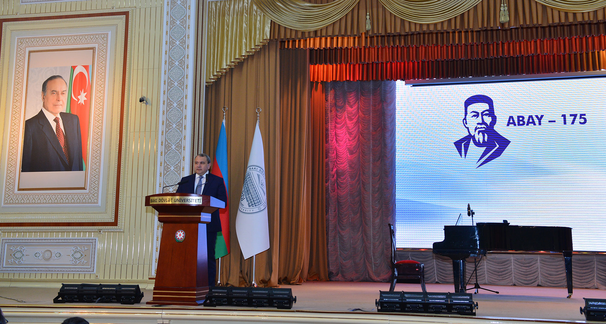 В большом актовом зале университета ректор Эльчин Бабаев, поздравив участников мероприятия со знаменательным событием, подчеркнул роль Абая Кунанбаева в литературе казахского народа и тюркского мира. По мнению ректора, подобные мероприятия, служащие пропаганде общей культуры, литературы, а также исторических личностей тюркоязычных народов, способствуют интеграции их национальных ценностей. По словам Эльчина Бабаева, в формировании мировоззрения Абая наряду с выдающимися деятелями Востока, такими как Физули, Низами, Фирдовси и Алишир Наваи, свою роль сыграли такие мыслители Запада, как Гёте, Крылов, Байрон. В своем выступлении Эльчин Бабаев отметил, что в БГУ состоялась презентация книги «Абай», проведены международные конференции, посвященные 550-летию Казахского ханства и 170-летию Абая Кунанбаева. Отмечено, что студенты из Казахстана прошли стажировку на нескольких факультетах вуза.