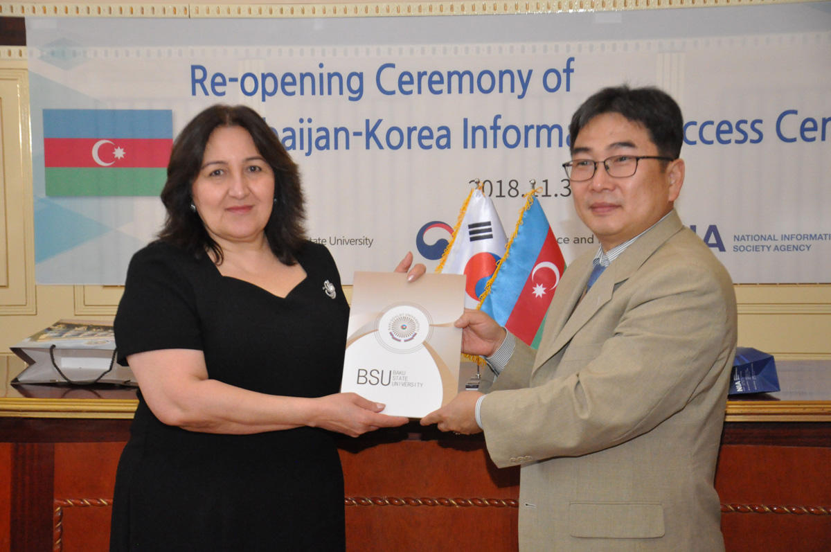Исполняющий обязанности ректора БГУ, профессор Ирада Алиева приветствовала гостей и высоко оценила обеспечение центра в связи с его 10-летием новым техническим оборудованием. Профессор Ирада Алиева сказала, что центр, открытый в 2008 году при содействии Корейского агентства национального информационного общества, за прошедшие 10 лет успешно проявил себя в таких областях, как повышение уровня знаний студентов и преподавателей в области ИКТ, выполнение расчетов, связанных с научными работами, и обеспечил участие сотрудников БГУ в конференциях, семинарах и тренингах в Корее.