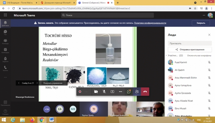 Диссертант кафедры химии высокомолекулярных соединений химического факультета Бакинского государственного университета (БГУ) Хазангюль Ибрагимова на научном семинаре выступила с докладом на тему «Механохимический синтез нанокомпозита PbS / Ni-Cr-LIH».
