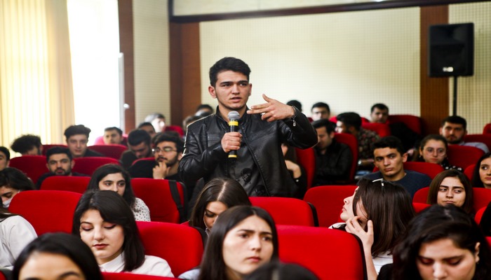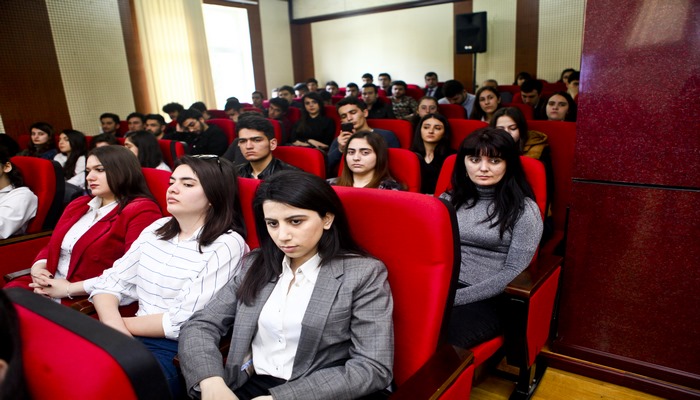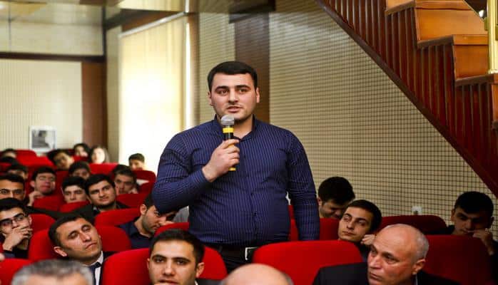 Сотрудник СГБ Турал Мамедов выступил с докладом «Понятие органов специальных служб, действующие в нашей стране в современную эпоху разрушительные силы, их деятельность среди молодежи». Гость подчеркнул, что процессы, происходящие в некоторых странах, особенно сложная ситуация в конфликтных зонах, столкновение с угрозами организованной преступности и другие проблемы требуют от нас бдительности. Турал Мамедов также отметил, что молодежь не должна забывать, что будущее государства, народа, стабильное и динамичное развитие страны зависит от их патриотизма, верности государственности и независимости.
