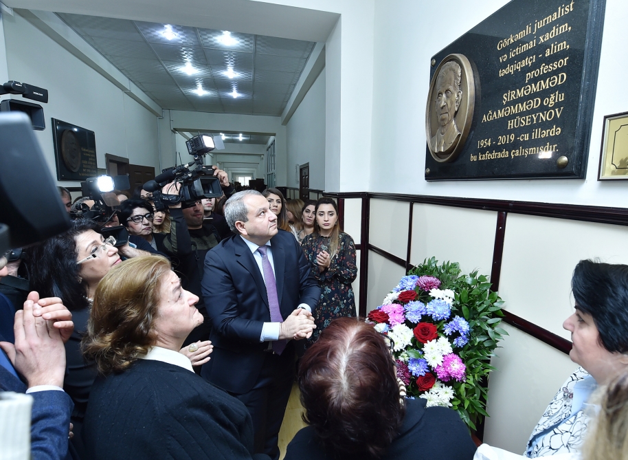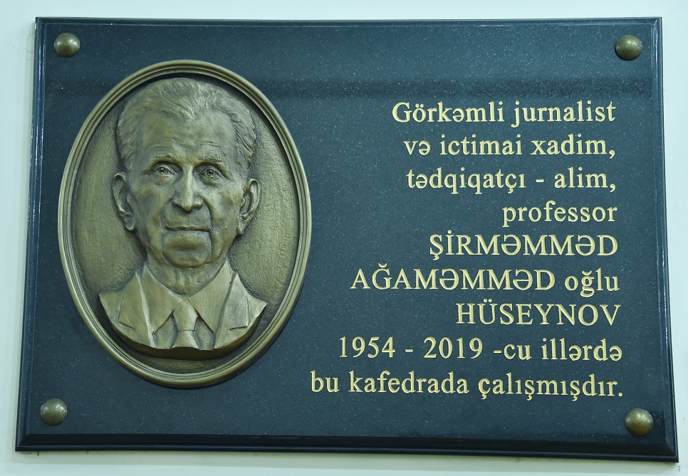 В Бакинском государственном университете (БГУ), перед кафедрой истории печати вуза состоялось открытие барельефа видному ученому Ширмамеду Гусейнову. Ректор Эльчин Бабаев на церемонии открытия сказал, что «Сегодня праздник азербайджанской журналистики. Мы собрались здесь, чтобы почтить светлую память профессора БГУ, неустанного исследователя прессы, заслуженного журналиста Ширмамеда Гусейнова по случаю 95-летней годовщины со дня его рождения. Ширмамед Гусейнов оставил такой след, который выпадает на судьбу не каждого ученого. Самым большим достоянием Ширмамед муаллима являются его студенты, воспитанники. Каждый раз, взглянув на этот барельеф, мы будем вспоминать его. Дело Ширмамед муаллима продолжается, ибо он, исследуя историю азербайджанской журналистики, оставил большое научное наследие. Жизненный путь Ширмамеда Гусейнова является примером для каждого. В настоящее время дочери ученого усердно трудятся на пути развития азербайджанской науки и культуры. Думаю, что мы, хоть и частично, постарались выполнить свой моральный долг перед великим ученым», - подчеркнул Эльчин Бабаев. Он рассказал о богатом творческом пути неустанного исследователя истории печати Ширмамеда Гусейнова, имеющего неоценимые заслуги в развитии отечественной журналистики.