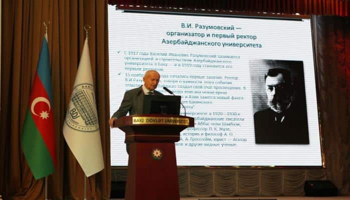 Ректор Эльчин Бабаев в своем выступлении рассказал об истории становления 100-летнего БГУ, его вкладе в развитие науки и образования. По словам ректора, парламент Азербайджанской Демократической Республики 1 сентября 1919 года принял закон «Об учреждении государственного университета в городе Баку», и вуз, который начал свою деятельность двумя факультетами, с момента создания стал источником гордости нации.