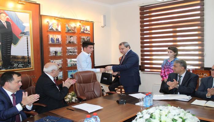 Затем Эльчин Бабаев в дар филиалу передал новый флаг БГУ, вручил ценные подарки трем студентам, набравших при поступлении в филиал в этом году свыше 500 баллов.