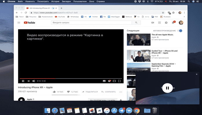 Пока что режим "Картинка в картинке" работает не со всеми сайтами, которые поддерживает Safari. Точно известно, что функция совместима с плеерами YouTube и "ВКонтакте". Поддержка режима должна быть добавлена владельцем сайта вручную.