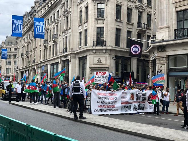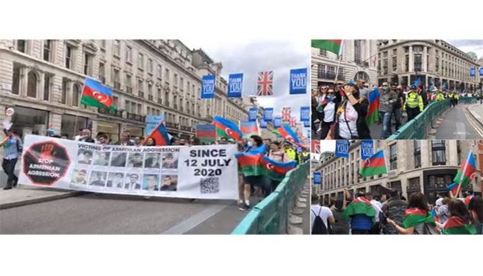 До 300 членов азербайджанской общины в Великобритании провели в Лондоне мирную акцию в связи с последней провокацией Армении против Азербайджана.