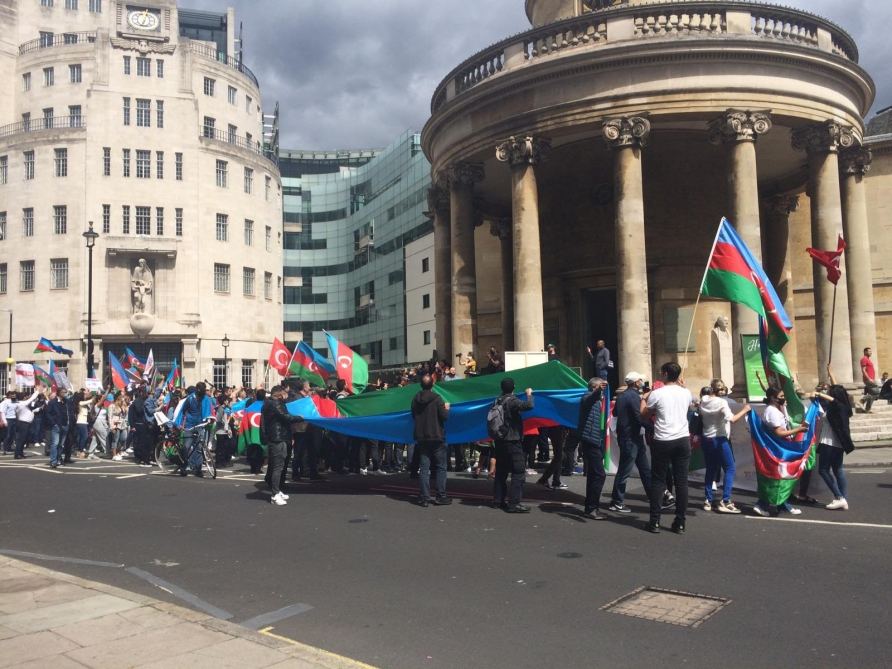 Kак сообщает Ens.az со ссылкой на Trend, вначале акция прошла перед лондонским офисом ВВС. Наши соотечественники, используя громкоговорители, скандировали лозунги "Хватит!", "Конец армянской агрессии!" и исполнили Государственный гимн Азербайджана.